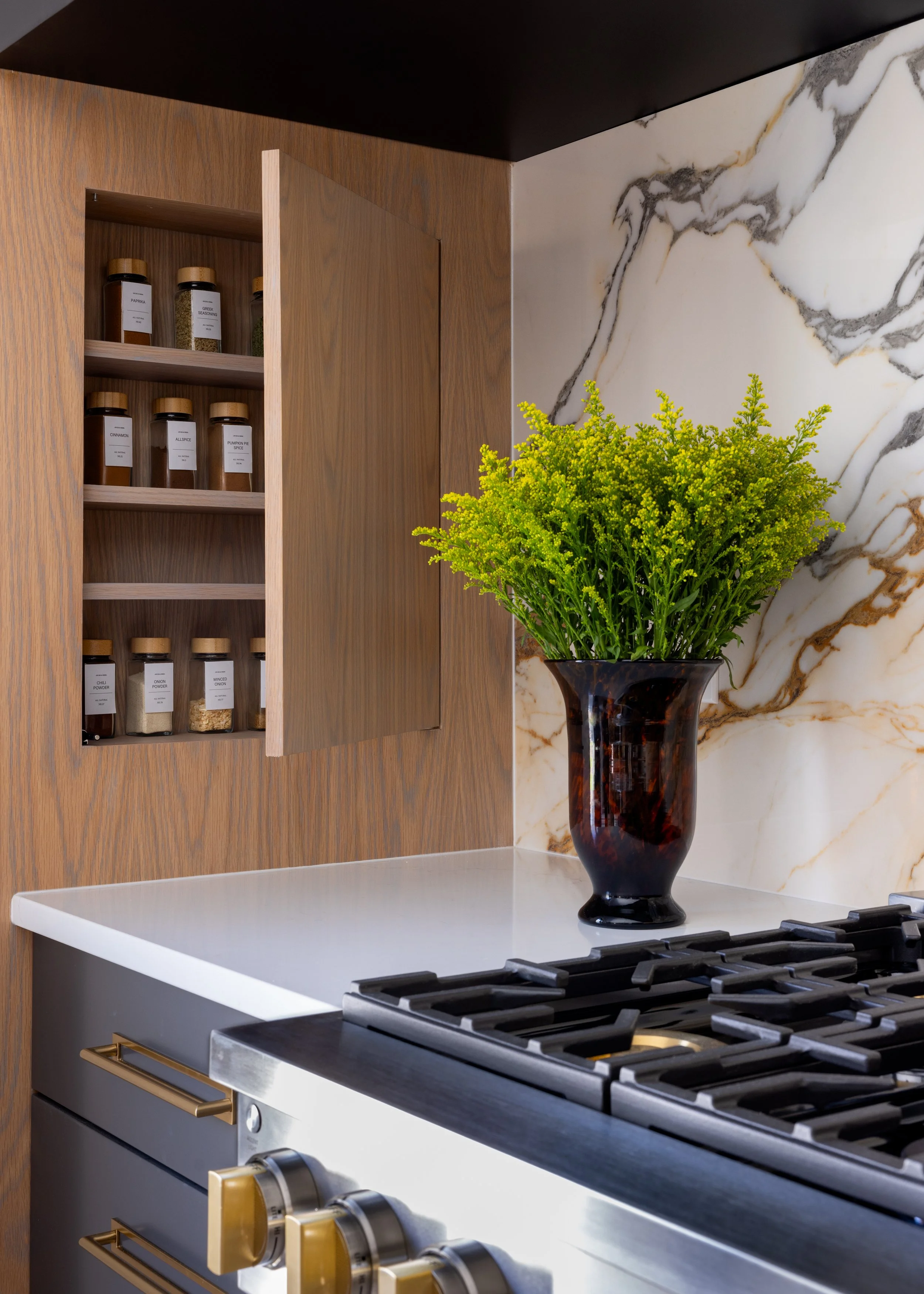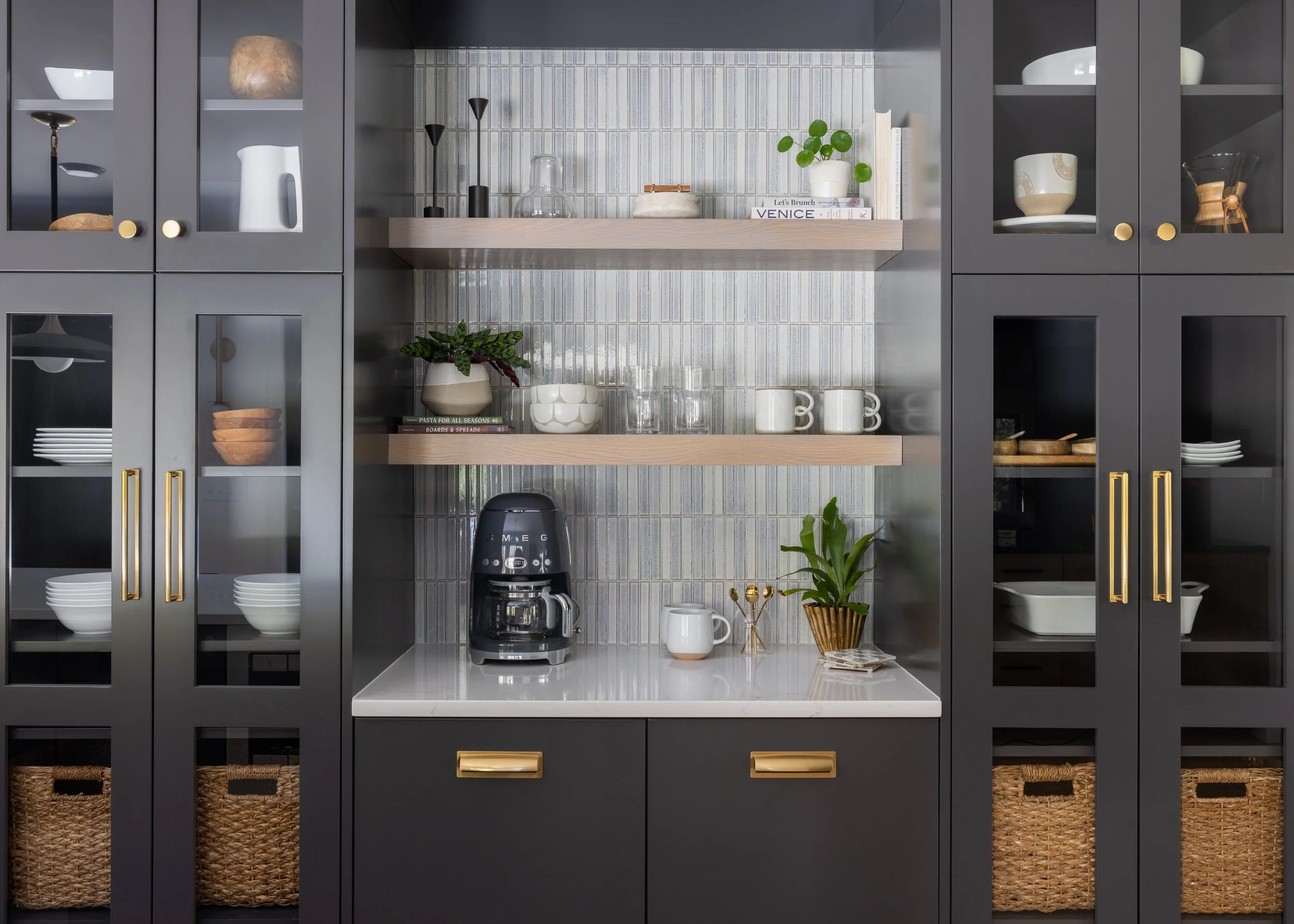 One of the guiding design principles for this kitchen was achieving a built in furniture look. The result is a space that feels more like a part of the home rather than a separate room. The addition of glass and meticulous trim details by the carpenter brought the concept to life, creating a harmonious blend of functionality and elegance.