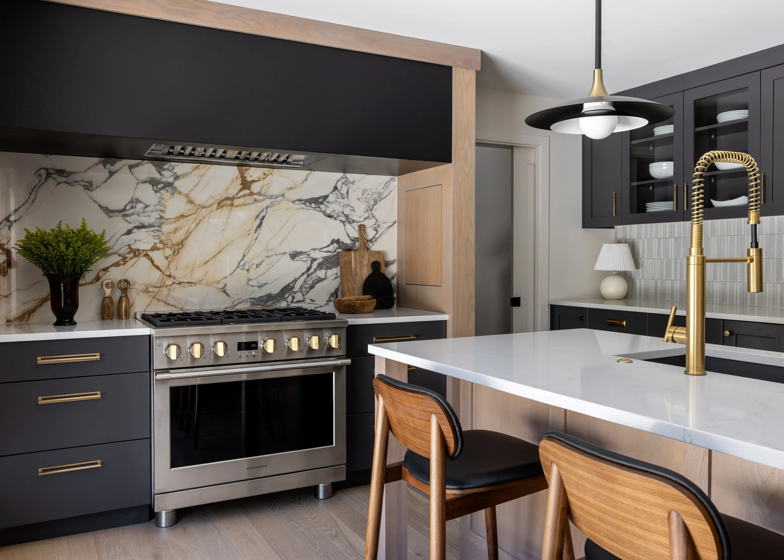 To elevate the design, the kitchen employs a mix of pewter cabinets and a coastal white oak-wrapped island and range surround. This combination adds depth and texture to the space, creating a sense of warmth and sophistication. The use of contrasting materials brings a timeless and versatile quality to the kitchens aesthetic. What truly adds excitement and visual interest is the inclusion of a mixture of stones and hand made tiles. This combination of materials creates a unique visual focal point in the kitchen and demonstrates how cohesion can be maintained while introducing variety and flair.